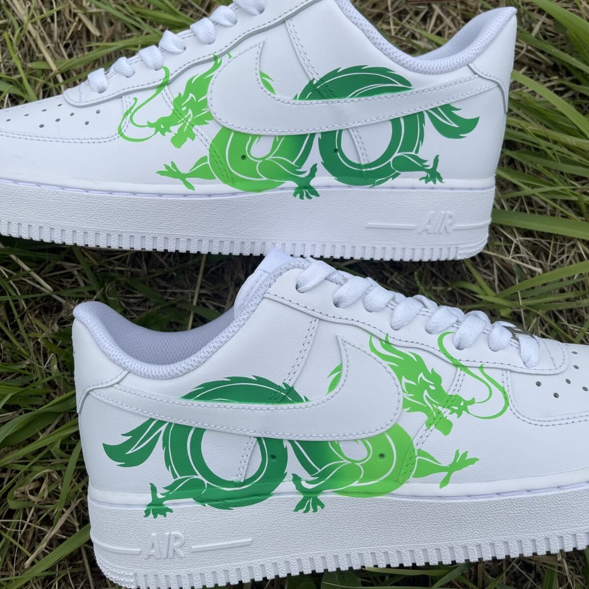 CUSTOM AIR FORCE 1 white painted with a fading dragon in green on the outsides. Painted with the best quality paint in the game. Scratch resistant and 100% waterproof.
