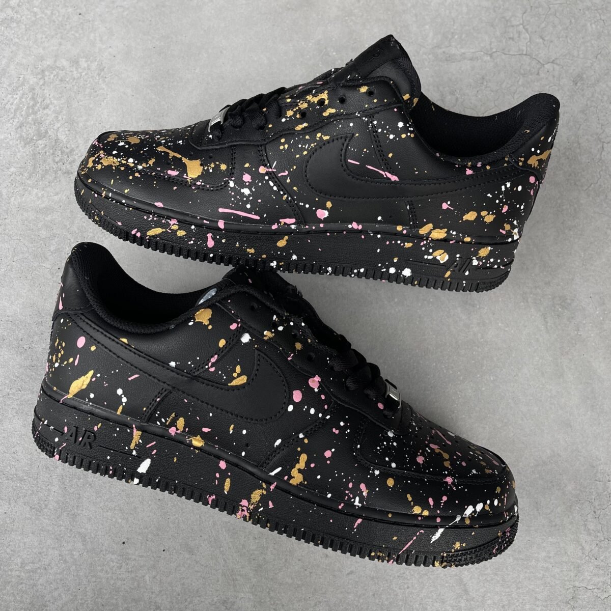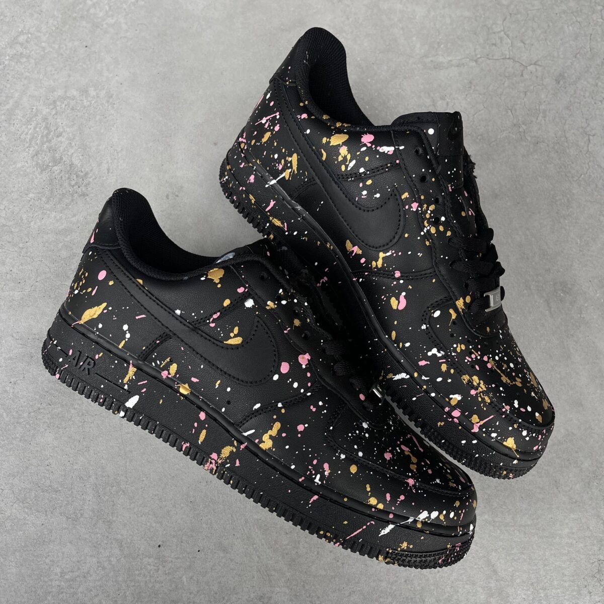 Custom AIR FORCE 1 black with white, gold and rose gold splash all over the shoes except the swoosh. Painted with the best quality paint in the game. Scratch resistant and 100% waterproof.