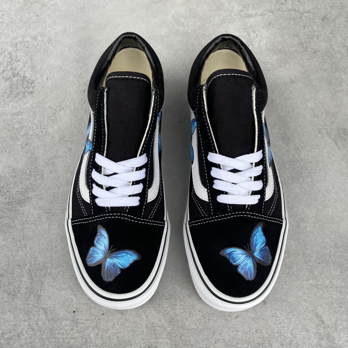 Custom Vans Old Skool OFF WHITE with blue butterfly’s all over. Made with the best quality iron on heat transfers.