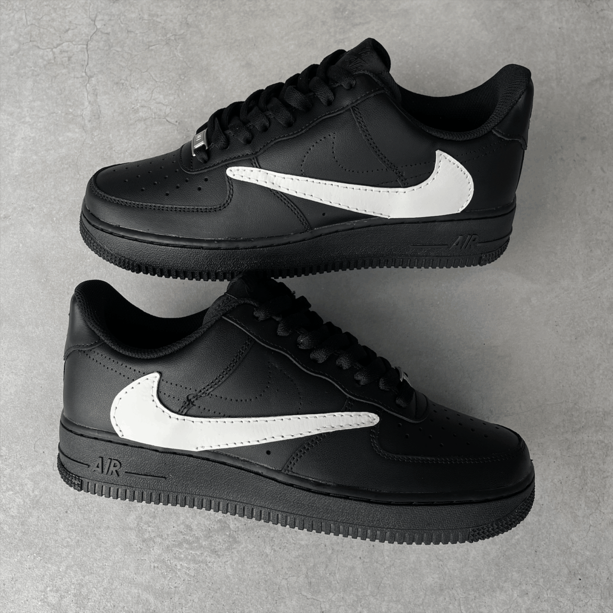 Custom AIR FORCE 1 black with a reverse white swoosh added. The reverse swoosh is glued and sewn on.