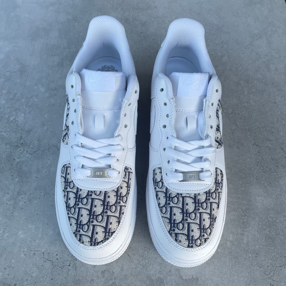 CUSTOM AIR FORCE 1 white with Christian D leather on the toebox and behind the swoosh. The leather is glued and sewn on.