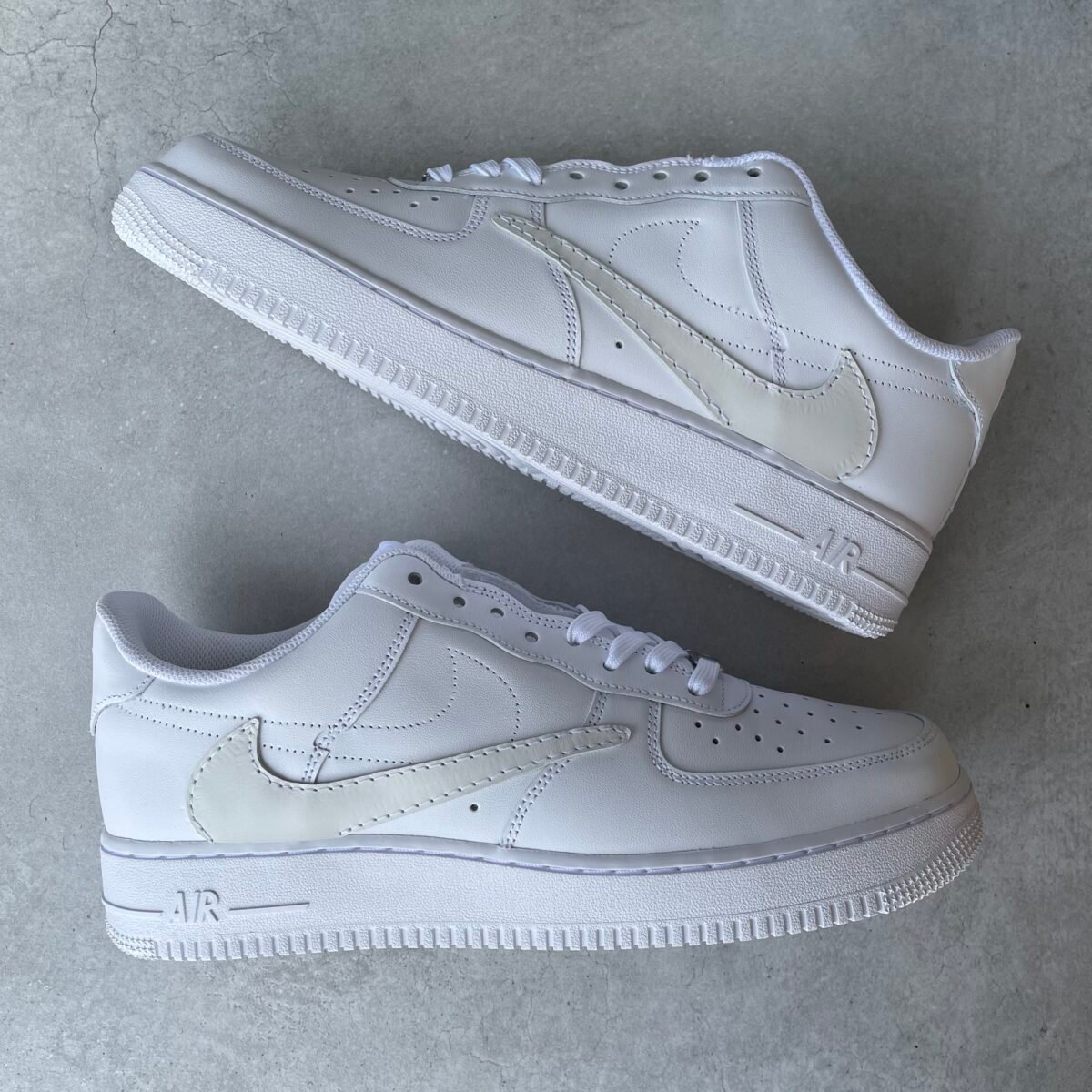 Custom AIR FORCE 1 white with a reverse white swoosh added. The reverse swoosh is glued and sewn on.