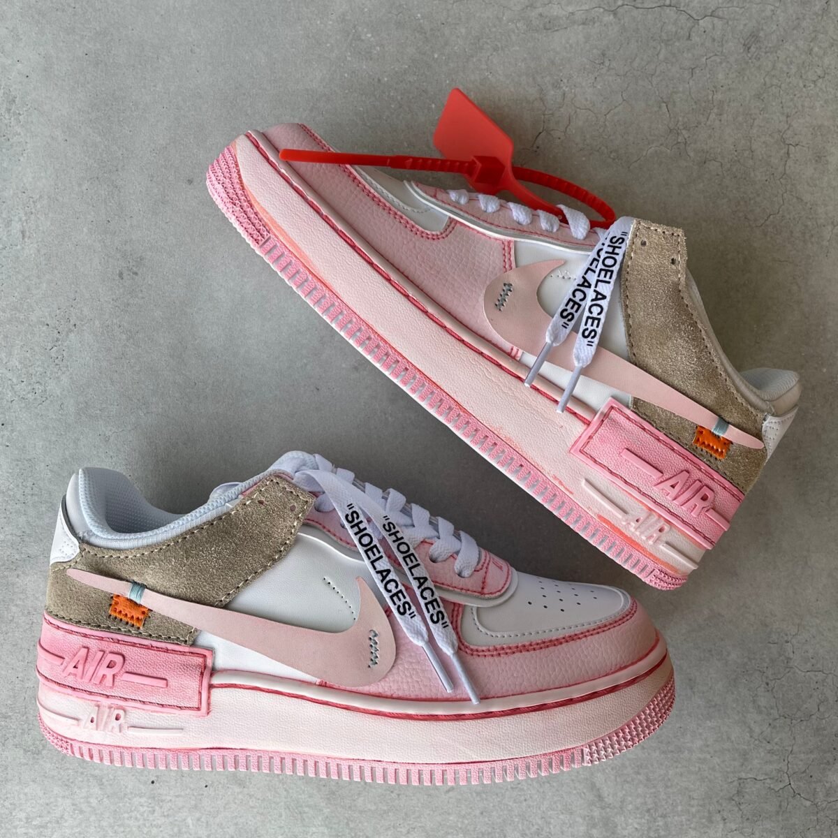 CUSTOM AIR FORCE 1 shadow painted with vintage pink paint on some parts. OFF WHITE text added to the insides and OFF WHITE style swooshes added on the outsided. The logo’s are sewn on in OFF WHITE style. Painted with the best quality paint in the game. Scratch resistant and 100% waterproof
