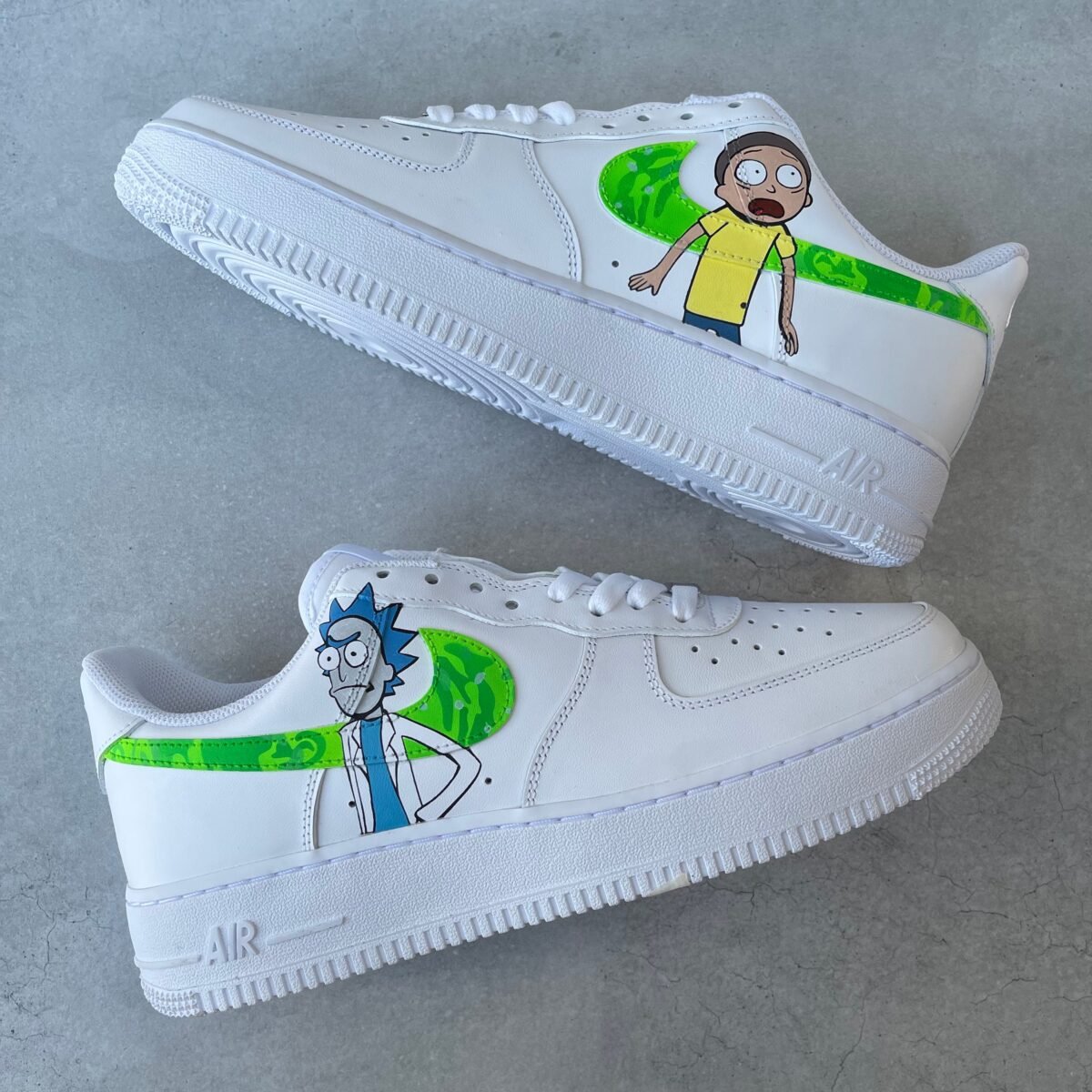 CUSTOM AIR FORCE 1 painted with Rick and Morty over the green Rick and Morty theme swooshes. Painted with the best quality paint in the game. Scratch resistant and 100% waterproof