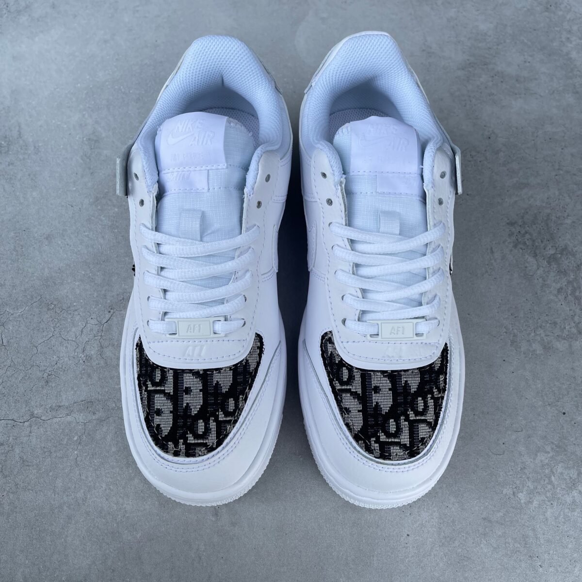 CUSTOM AIR FORCE 1 shadow with Christian D classic fabric on the toe box and behind the swoosh. The fabric is glued and sewn on