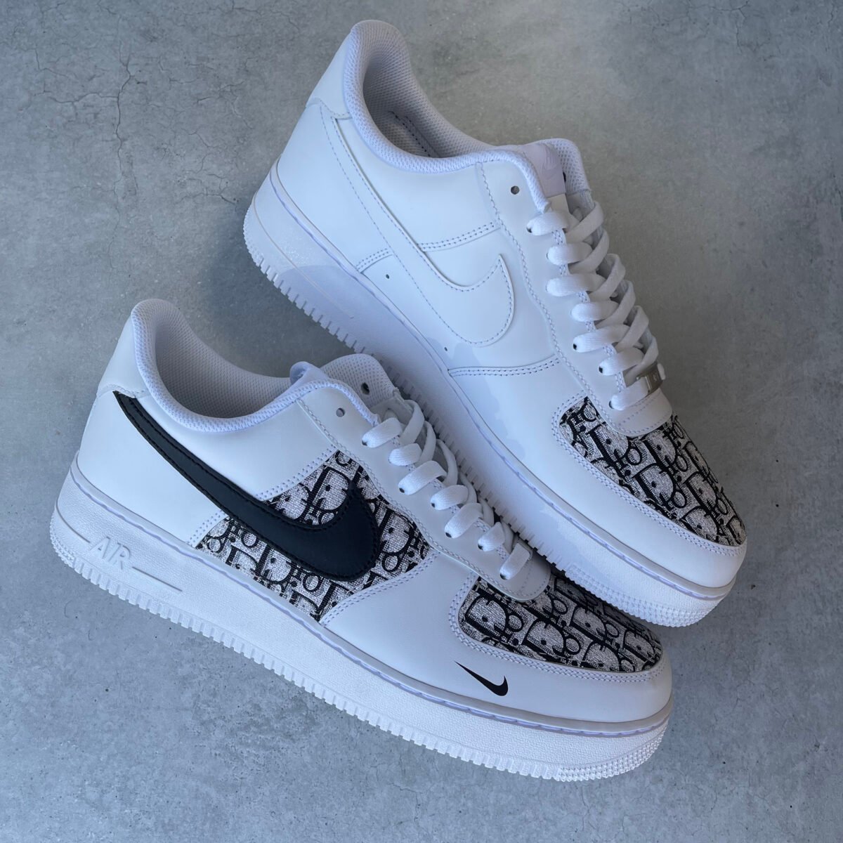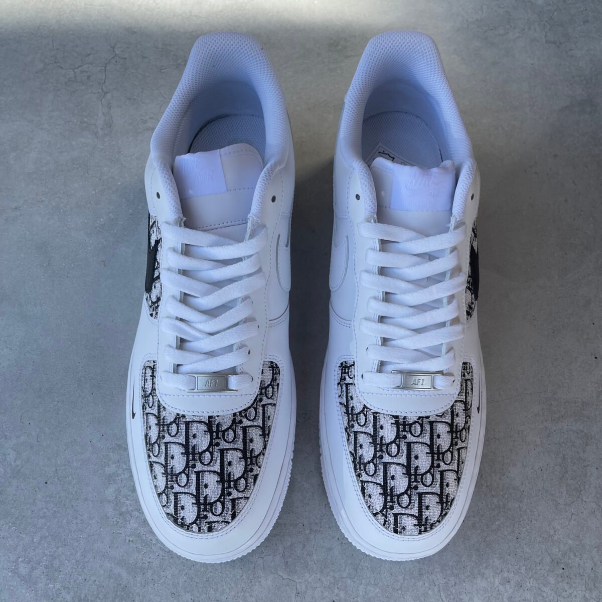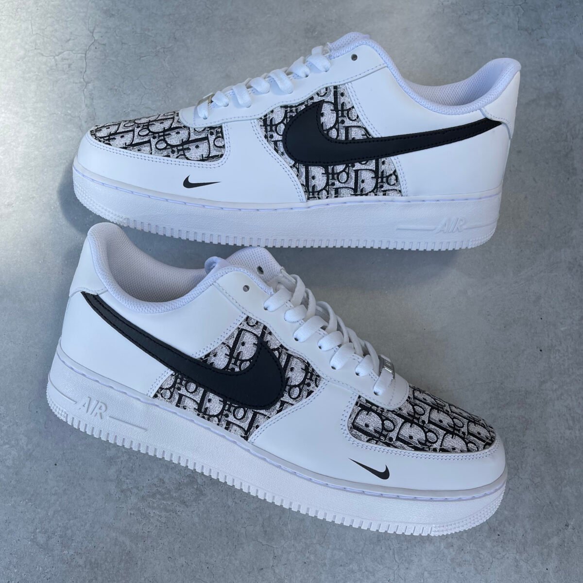 Custom AIR FORCE 1 white with Christian D leather on the toebox and behind the swoosh. The leather is glued and sewn on. The swooshes are blacked out and a little black Nike swoosh has been added as a small detail.