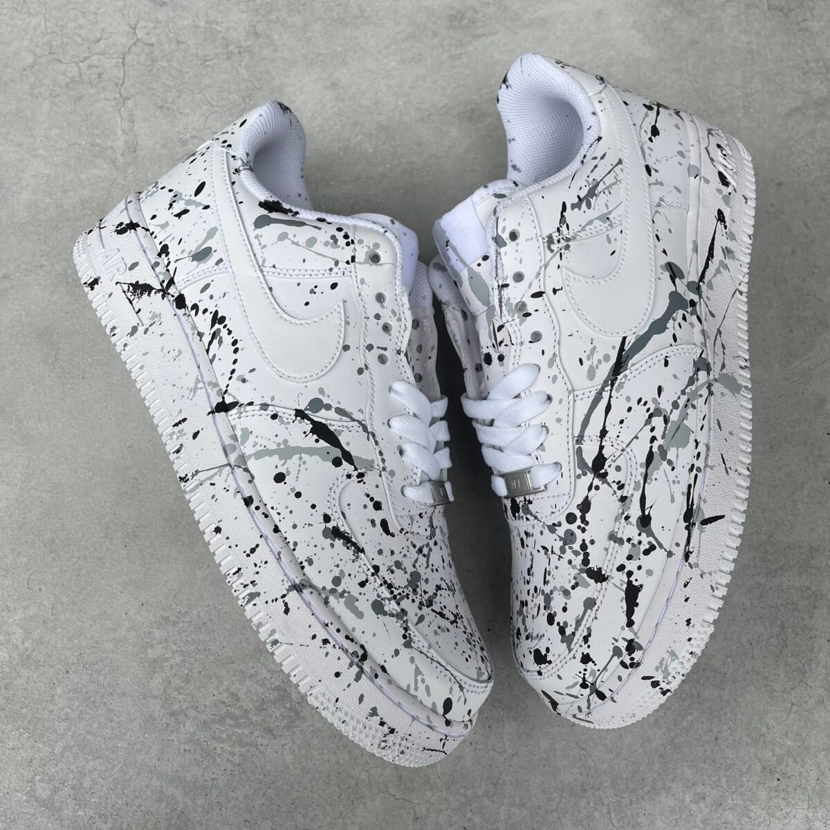 CUSTOM AIR FORCE 1 with dark grey, grey and black splash all over except for the swoosh. Painted with the best quality paint in the game. Scratch resistant and 100% waterproof