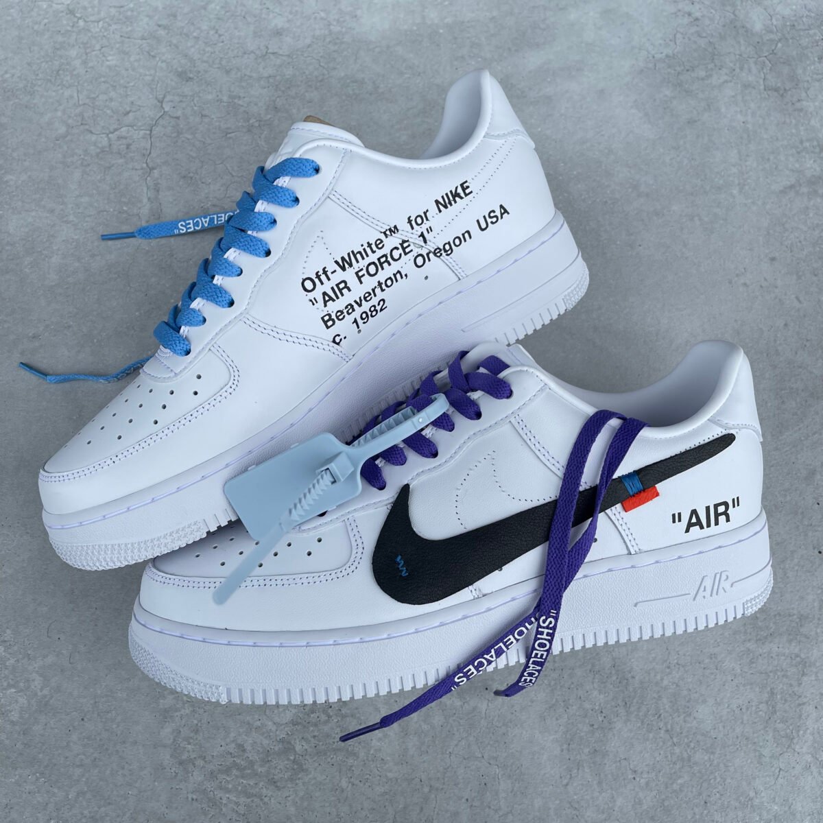 Custom AIR FORCE 1 with the OFF WHITE style swoosh, OFF WHITE text on the insides and the “AIR” on the heel. Painted with the best quality paint in the game. Scratch resistant and 100% waterproof. The swoosh is sewn on.Â