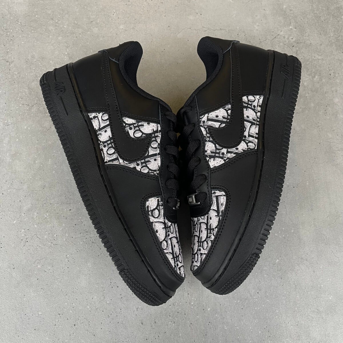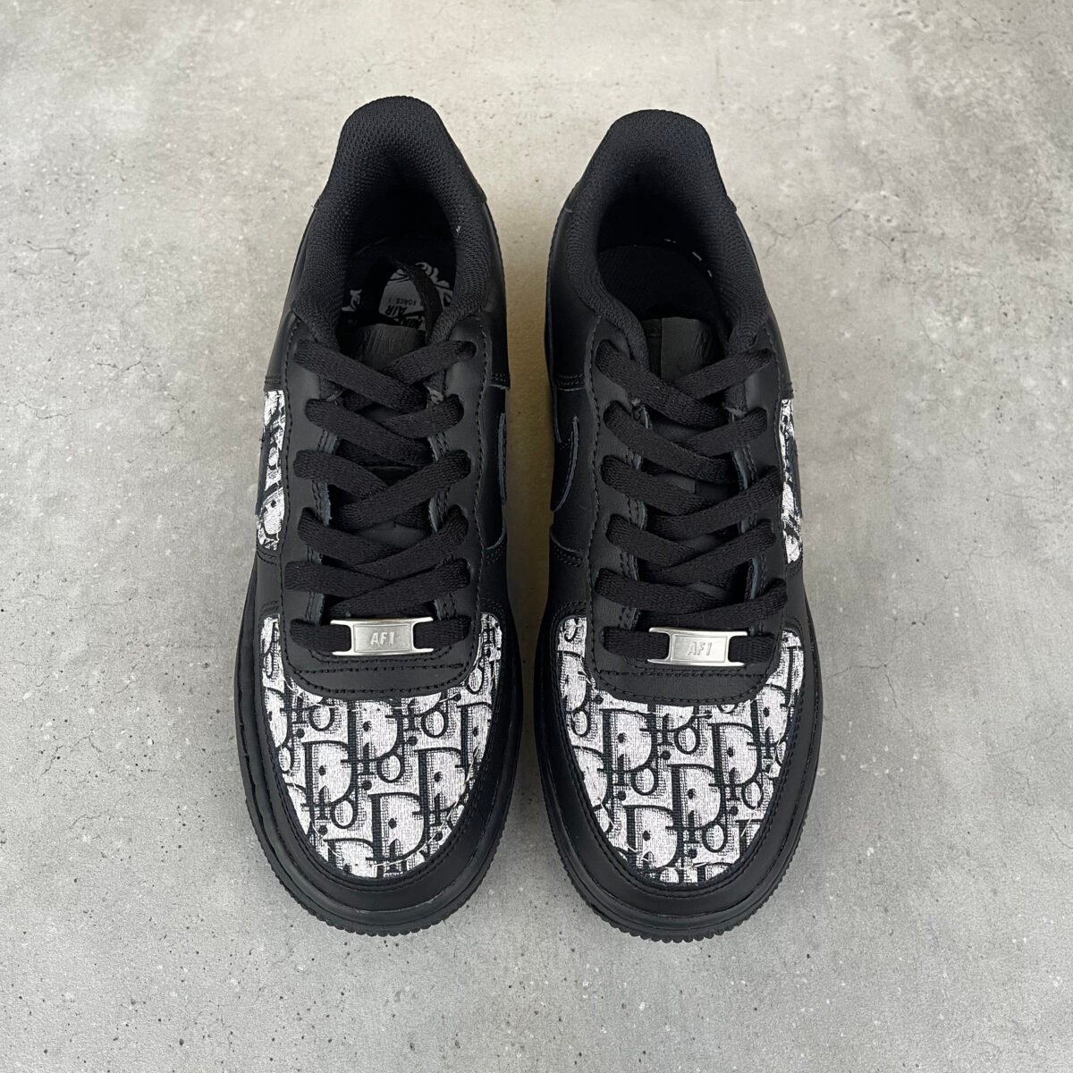 CUSTOM AIR FORCE 1 black with Christian D leather on the toebox and behind the swoosh. The leather is glued and sewn on.