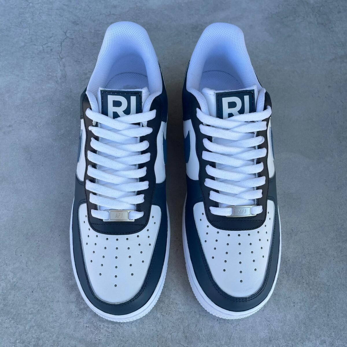 CUSTOM AIR FORCE 1 painted with different tints of dark blue. Painted with the best quality paint in the game. Scratch resistant and 100% waterproof. (The custom label with RJ as seen on the pictures WILL NOT be added)