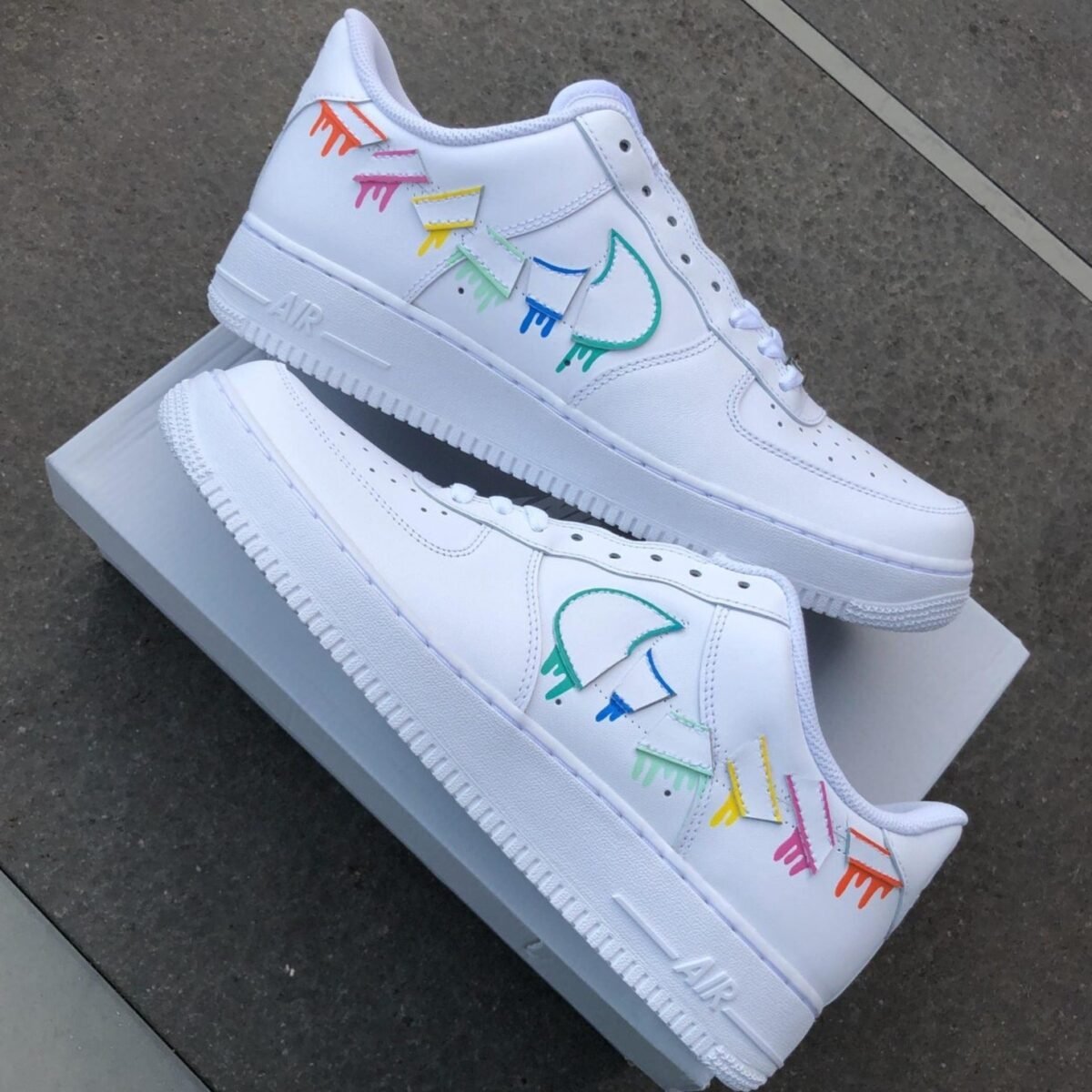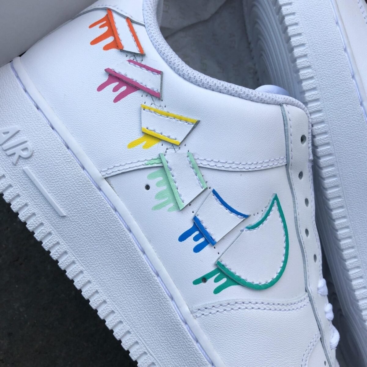 CUSTOM AIR FORCE 1 with the outline dripping destroyed swooshes in turqouise/blue/mint/yellow/pink and orange. The swoosh is removed, cut out in pieces and sewn back on.